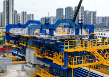 這臺智慧造橋機宛如一個鋼鐵巨獸,呈半 “T” 型結構,雖凈重 75.7 噸,卻行動靈活且功能強大。它由承重桿件、液壓整體模板、液壓調節(jié)、自動走行、信息化監(jiān)控、平臺防護等多個系統(tǒng)協(xié)同組成。在施工時,頂部作業(yè)平臺宛如一個忙碌的空中工廠,鋼筋綁扎、混凝土澆筑、蒸汽養(yǎng)護、自動噴淋等工序有序開展;機身周圍的安全通道,則為工人的作業(yè)安全提供了堅實保障。隨著施工推進,它還能自動前行,精準完成一段又一段梁體的建造,直至橋體完美合龍。